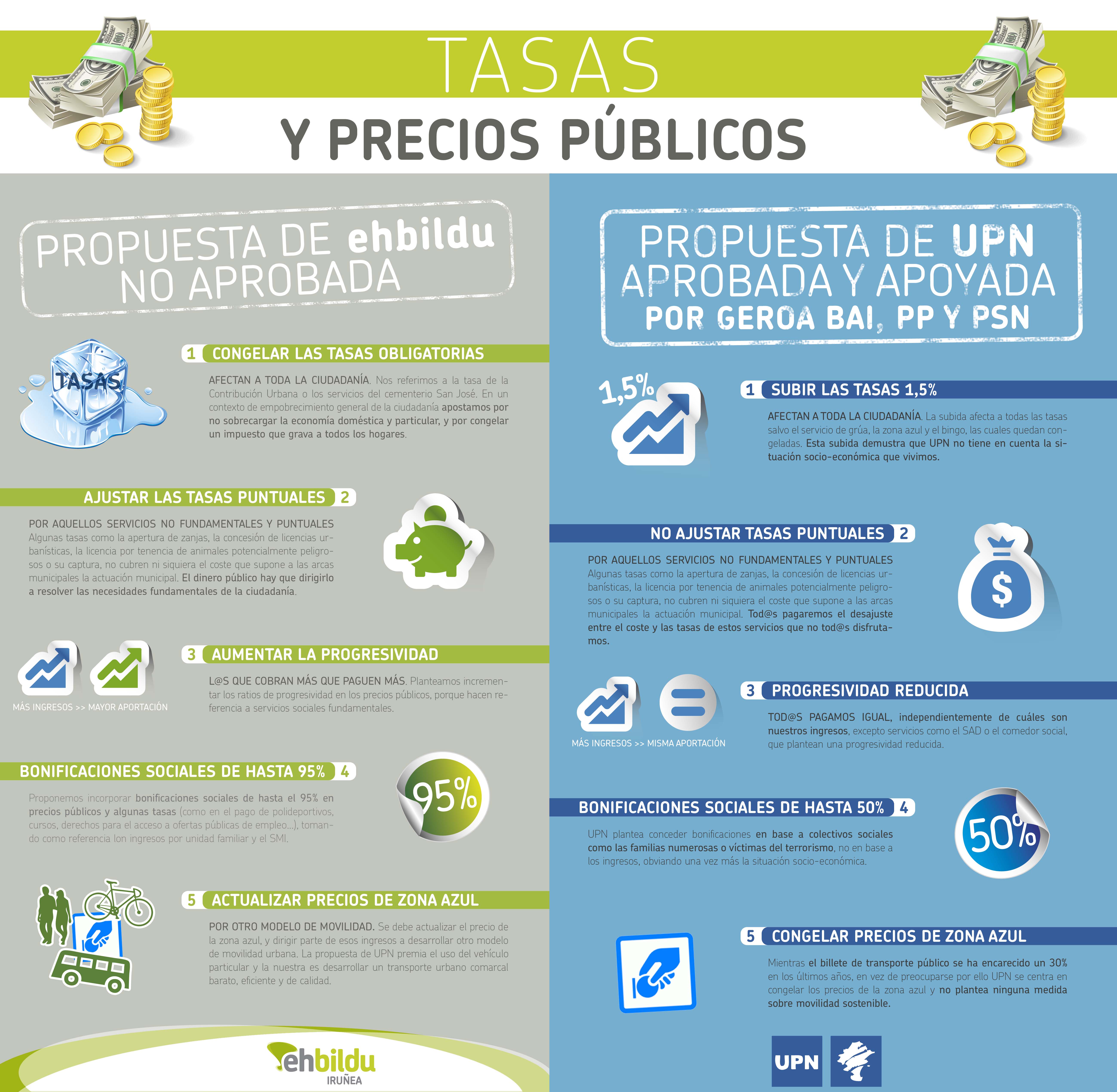 El caso es que, en mitad de ese pretendido despiste, UPN aprobó en el pleno del día 18 con los votos de Geroa Bai, PSN y PP las tasas y precios públicos para el año 2014. Esto es, aprobó lo que nos van a cobrar a las vecinas y vecinos para llevar adelante su presupuesto. Desde EH Bildu se llevó un propuesta en donde se apuesta por congelar las tasas que nos afectan a todas y todos, por ajustar las puntuales, por un aumento de la progresividad, esto es, para que los que más cobran paguen más, en estos tiempos en donde las desigualdades sociales son cada vez más agudas se apuesta por implementar unas bonificaciones sociales de hasta un 95% y por actualizar los precios de la zona azul dentro de un nuevo modelo de movilidad. UPN presentó una propuesta totalmente contraria a esto. Y eso es lo que apoyaron Geroa Bai y PSN.