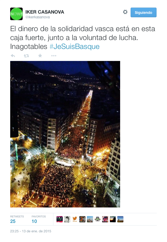 Apenas dos días después asistíamos, en medio de la impotencia y de la rabia, a la detención de 16 personas en Euskal Herria. De nuevo una operación, continuación hasta en el nombre, de la razia policial que se desarrolló hace justo un año y cuyo objetivo primero era y es la asistencia jurídica de que las presas y presos vascos disponen. El objetivo principal puede encuadrarse en los intentos, cada vez más desesperados, del gobierno del PP y del Sistema español para seguir entorpeciendo, no solo el camino hacia la resolución del conflicto, si no la determinación mayoritaria para lograr un cambio social y político que de la vuelta al País. Repetimos imágenes y respuestas que se empeñan en no dejarnos olvidar y otra vez tuvimos que esperar detrás de una valla policial mientras registraban los despachos de abogados y abogadas. De nuevo nos concentramos frente a la sede del Partido Popular gritando al unísono Je Suis Basque, a ese partido cuyo presidente, y jefe del gobierno español, vimos en el acto propagandístico que prepararon al albor de la manifestación de apoyo al semanario Charlie Hebdo. La misma persona que, aunque sea propagandísticamente, participaba en una manifestación a favor de la libertad de expresión en el Estado francés, al día siguiente daba un golpe a las libertades y al derecho de defensa, maquillado con un supuesto delito fiscal.