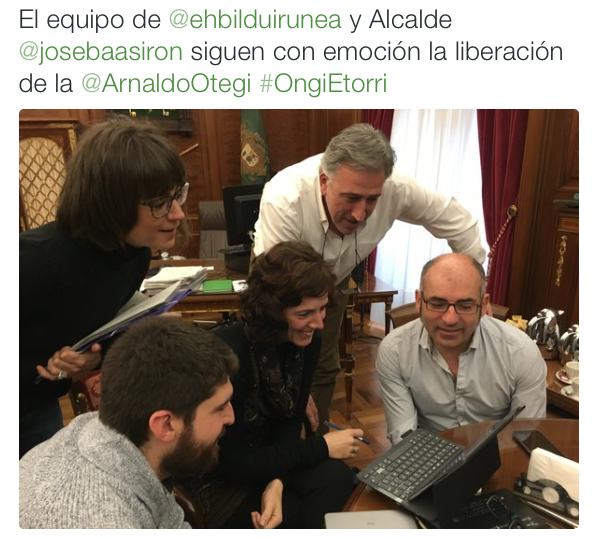 En muchos lugares de Euskal Herria, y aún fuera de aquí, en oficinas, en la calle, en casas y en hospitales, se ha seguido con atención la salida de la cárcel de Arnaldo Otegi. El histórico dirigente y militante abertzale ha salido bastante puntual, a las 8.55 de la mañana y con una sonrisa en su rostro, esa sonrisa que durante estos seis años largos que ha estado en prisión ha insistido en que mantuviésemos en el día a día de este Pueblo expectante y esperanzado. Los abrazos y besos, las felicitaciones y guiños, los cariños y sonrisas han dado paso a sus primeras palabras en libertad. Han sido las palabras de Arnaldo, de ese Arnaldo militante que tiene los pies en la tierra, recordando, primero, a los presos sociales, a los migrantes expulsados y a las personas desahuciadas. Ha sido el mejor ejemplo de una persona comprometida con su Pueblo y con la justicia social en cualquier lugar. Porque lo metieron vasco y vasco ha salido, lo encarcelaron independentista e independentista lo han soltado y lo encerraron socialista y socialista lo han liberado. Y como buen vasco, independentista y socialista, ha salido también, tal y como entró, internacionalista. La solidaridad entre los pueblos ha sido también, la imagen de la mañana, con banderas de diferentes lugares, entre las ikurriñas y banderas navarras, símbolos de Catalunya y de Andalucía. Y entre toda esa gente, la que se encontraba a las puertas de la prisión de Logroño y la que nos encontrábamos en nuestra casa, en nuestros trabajos o, como el Alcalde de Iruñea y concejales de EH Bildu, en el trabajo, la sensación principal ha sido la de una inmensa emoción.