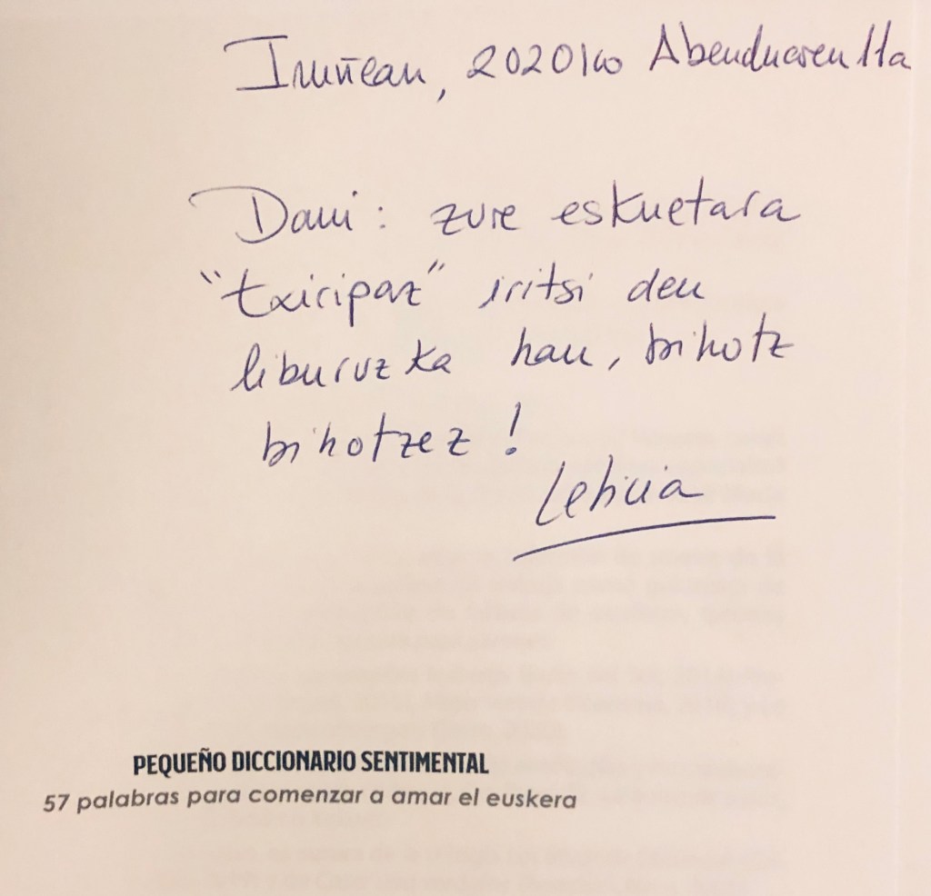 Y así, no podía ser de otra manera, me compré yo también el libro, en Chundarata, porque en Walden ya se les había terminado, pero al fin y al cabo en una maravillosa tienda de barrio, con su decoración navideña que este año es una mesa con todo el servicio de té, sacado de Alicia en el País de las Maravillas, que no os podéis perder (Chundarata y Walden están en Paulino Caballero, en el 27 y en el 31 respectivamente… y si el libro es de viajes o paseos, en medio de las dos tenéis Muga, en el 27 también…). Y me lo ventilé en una tarde, y eso que paraba con cada palabra por puro deleite y pensando en mis propias palabras del euskera sentimental. Palabras que forman parte de mi vida, como xirimiri, con esa x tan suave pero que impregna todo, ama, porque sigue siendo sin estar ya, osaba en la voz de mi sobrino Amaiur, muxu que besa ya en la palabra, mandarra, que es la imagen de mi abuela en la cocina, ixiliko nahi, que nos decía nuestro abuelo porque su ama se lo decía de txiki, maitia, que siempre me llaman las Goñi, txapela, porque el aita es de los que mejor la lleva, como la llevaba su padre, bihotza, porque a pesar del frío te llevo tan dentro de mí.